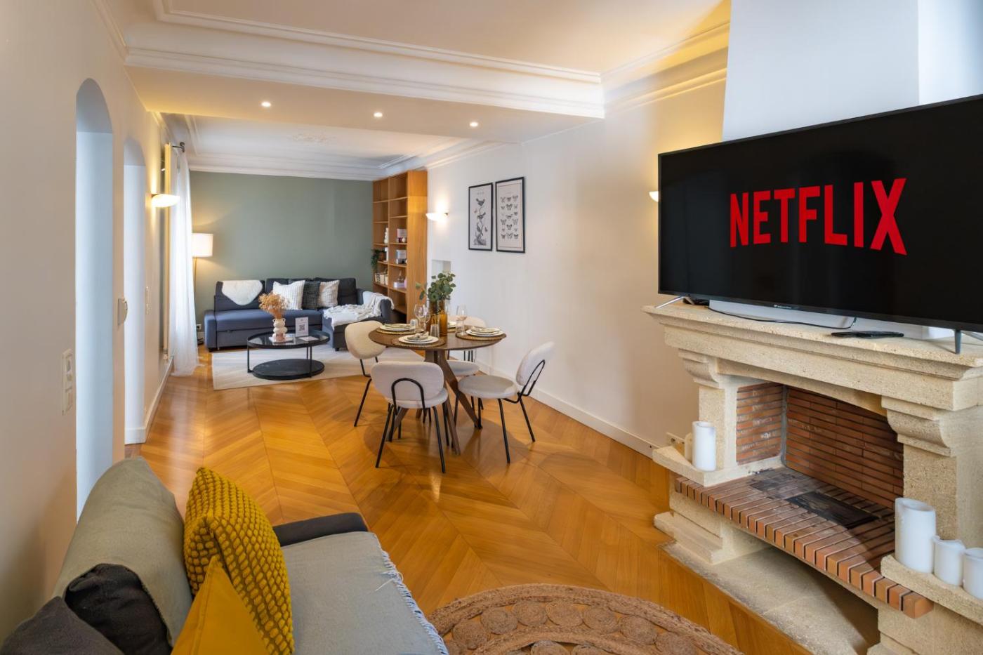 The 1-bedroom apartment features 2 living rooms with a flat-screen TV, a fully equipped kitchen with a dishwasher and an oven, and 1 bathroom with a hair dryer. There is also a seating area and a fireplace.