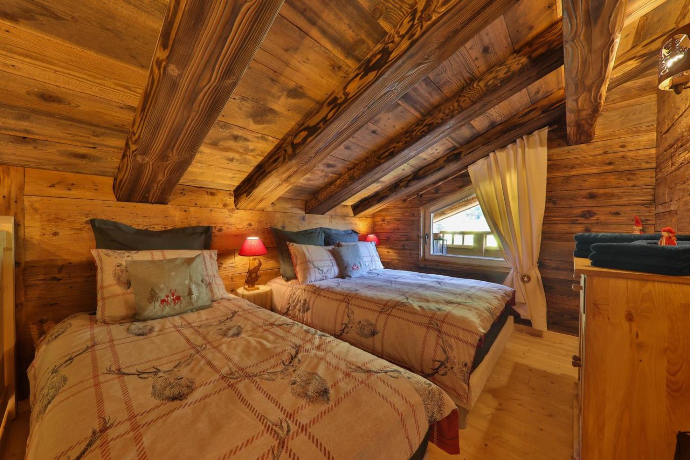 Two-Bedroom Chalet. This chalet boasts a hot tub, spa bath and sauna. This spacious chalet is comprised of 1 living room, 2 separate bedrooms and 2 bathrooms with a walk-in shower and free toiletries. Guests will find a stovetop, a refrigerator, a dishwasher and kitchenware in the kitchen. The chalet also has a barbecue. The chalet offers a washing machine, a private entrance, soundproof walls, a flat-screen TV with cable channels, as well as garden views. The unit offers 5 beds. ;