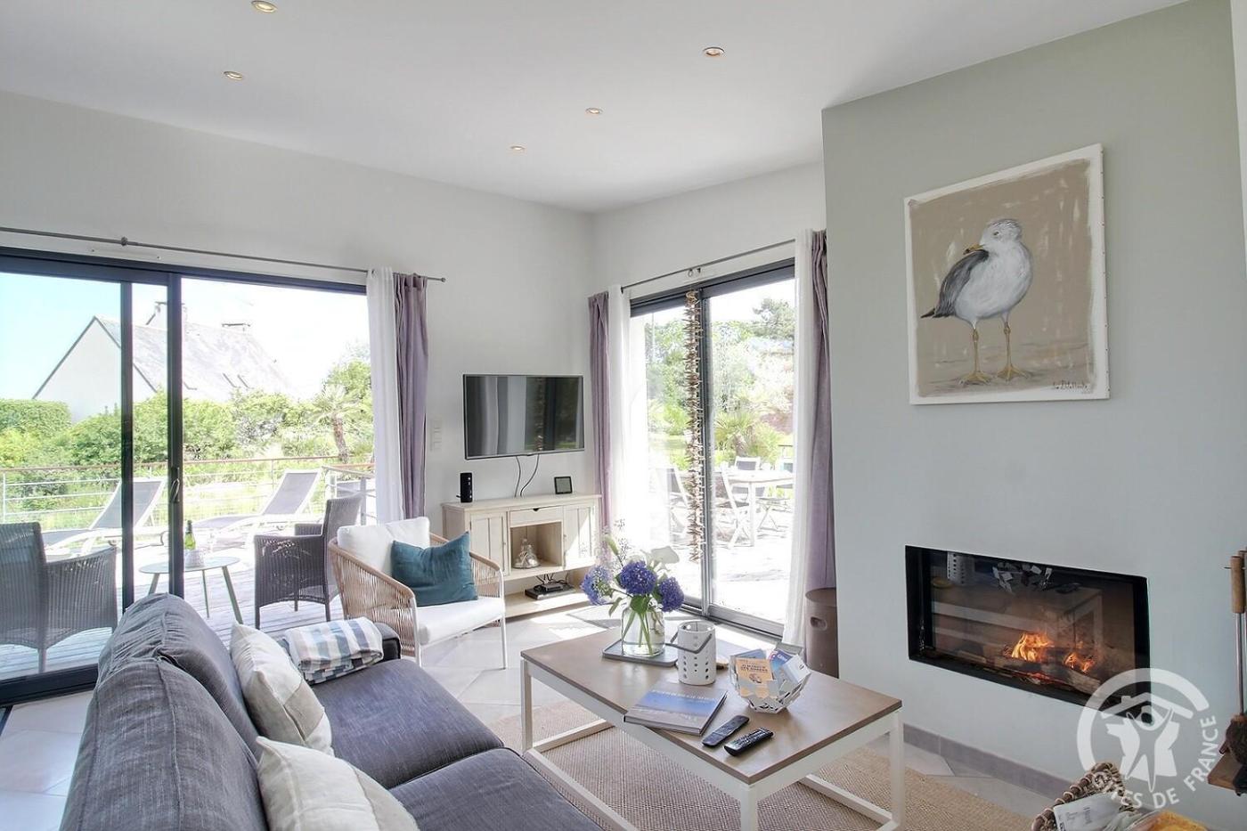 The holiday home is fitted with 2 bedrooms, 1 bathroom, bed linen, towels, a TV with satellite channels, a dining area, a fully equipped kitchen, and a terrace with sea views. There is also a seating area and a fireplace.